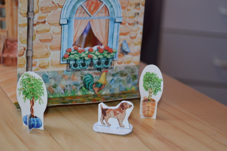 На крыше - флюгер! На подоконниках - цветочки в горшках. Все двери открываются, и даже лестница "настоящая", со ступеньками и прорезью в полу.