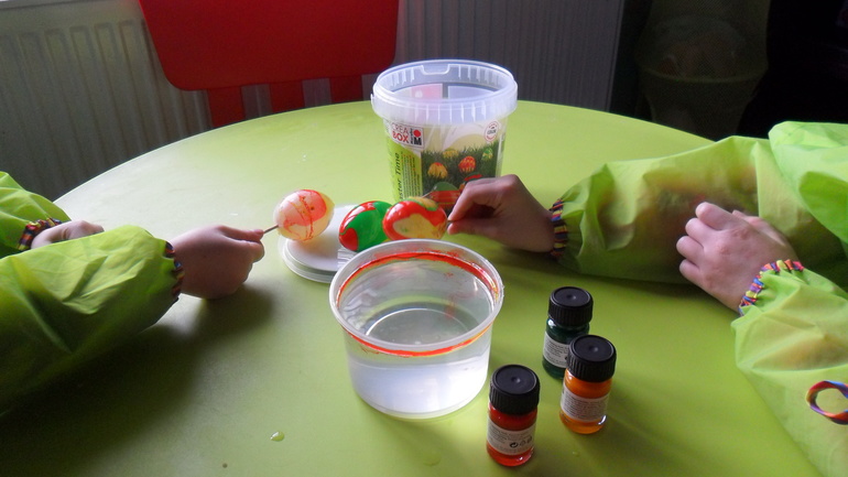 На днях увидела в магазине набор (краска и пластиковые яйца) именно для подобной забавы. Купила для детей, чтоб провести вместе время в творческом процессе.