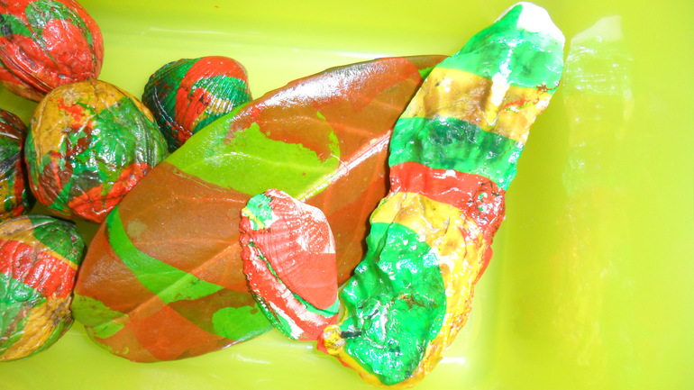 Но... этого оказалось мало. Стали красить все что под руку попалось. Ракушки - отлично красятся. На черных камушках краски не видно, но полагаю, что на светлых получится. Покрасили листочки, орехи, палочки... Детей было не остановить в их порыве.