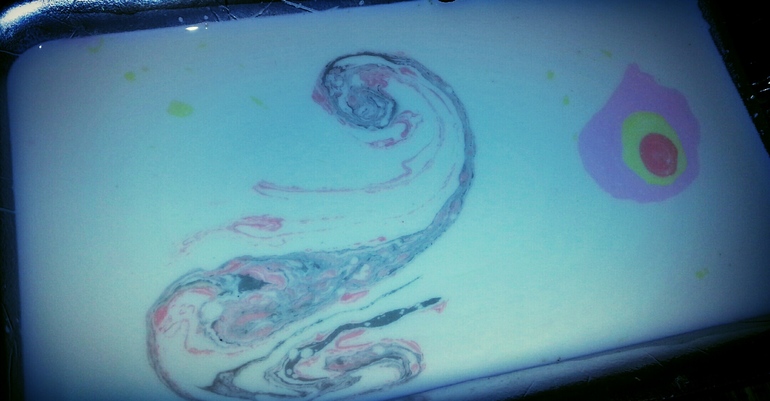 Сейчас использовали молоко пожирнее и рисовали "точками", и дело пошло!:) Увлекательно! Потом "отпечатывали" рисунки на бумагу, очень нежные цвета получились:) Спасибо Лизе!