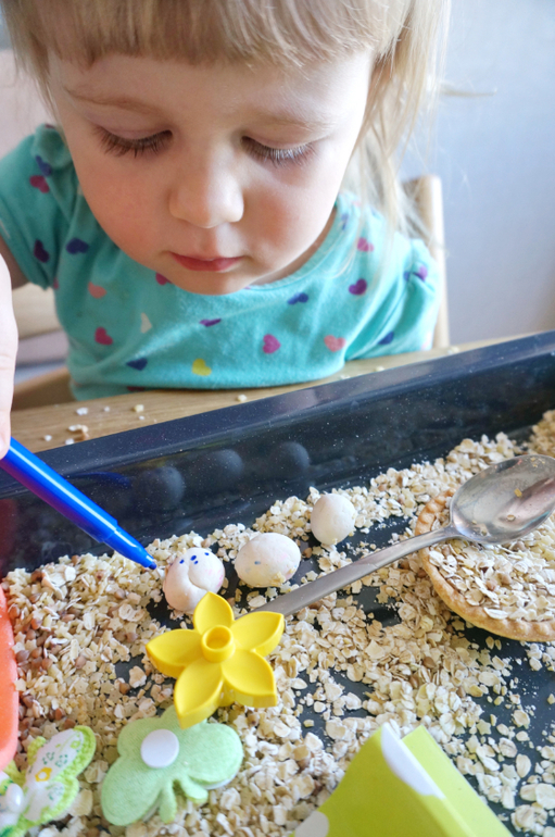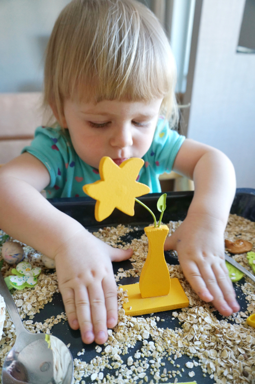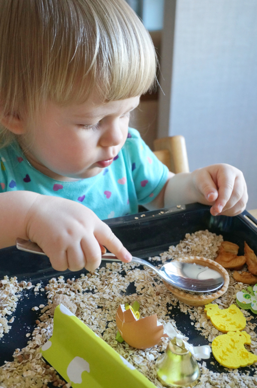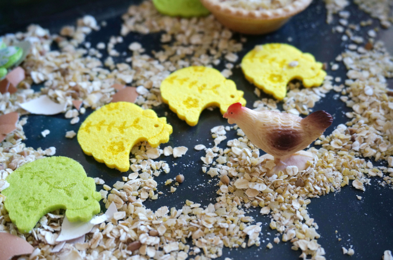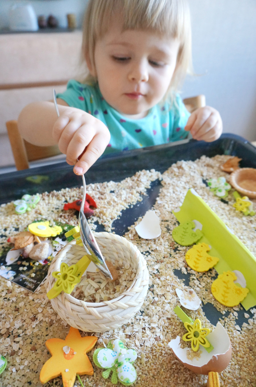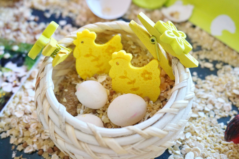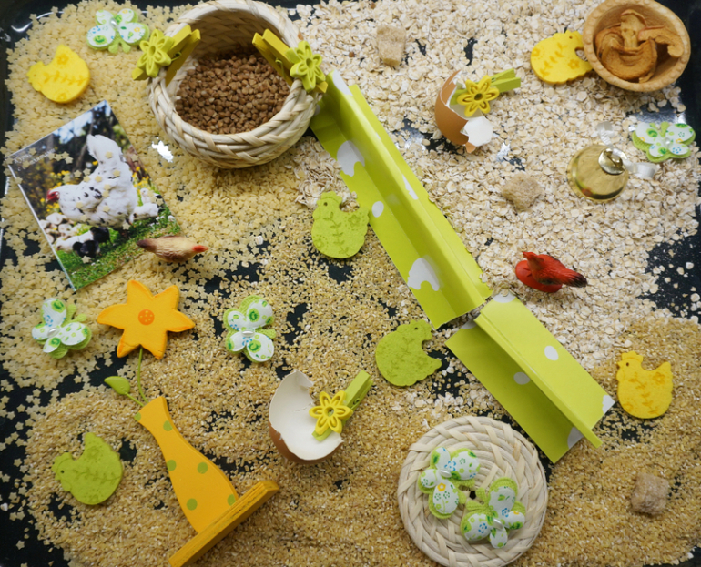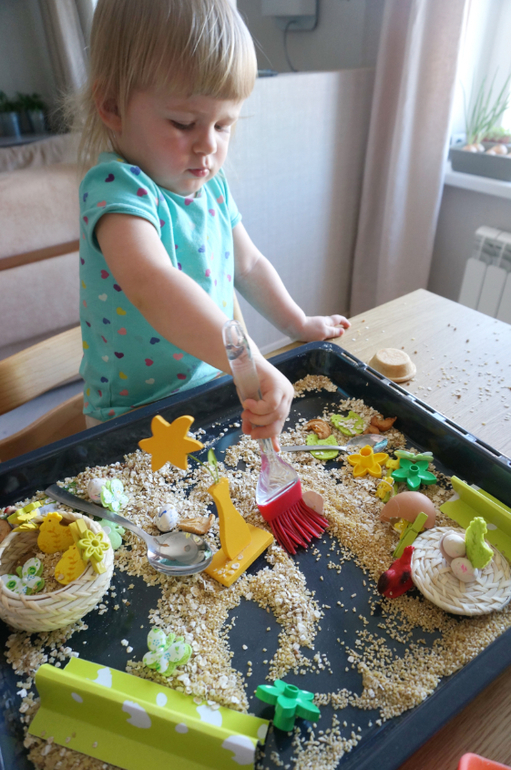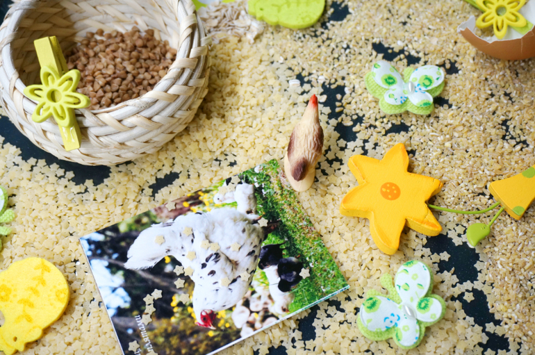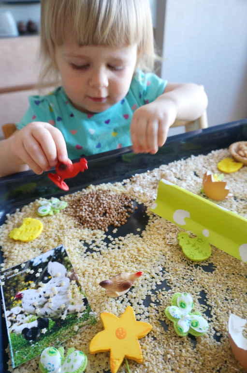 Игры и игрушки от 0 до 99 (Про игры и игрушки которые подойдут и большим и маленьким)После работы с покраской соли, Машу прямо тянет на сыпучести. Давно я не делала ей сенсорных коробочек. Весна, скоро Пасха, у меня припасен был небольшой пасхальный наборчик для творчества, отсюда и вытекла вся идея. Основа- злаки, мелкие макароны, пасхальные курочки, цветочки, бабочки, из съедобного - коричневый сахар, сушеные яблоки, тарталетка, и всякие мелочи. Играли больше часа, а потом со слезами пошли гулять, так уж не хотелось расставиться с курятником!
