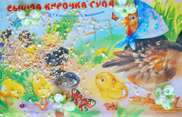 Маша не долго думая, принесла нашу книгу с песенками и начала уже кормить курей прямо там.