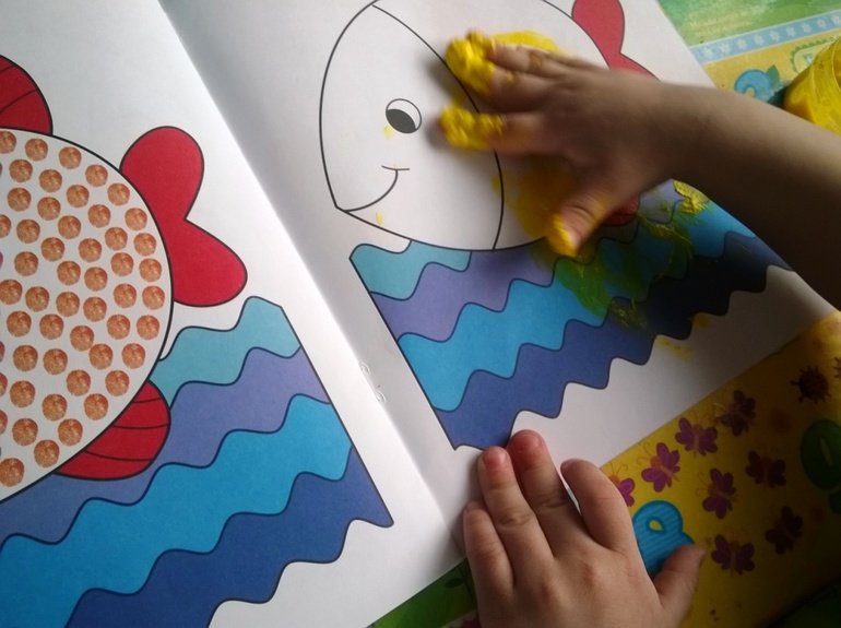 А после дневного сна раскрашивали пальчиковыми красками рыбку из пособия Рисуем пальчиками. ШСГ".