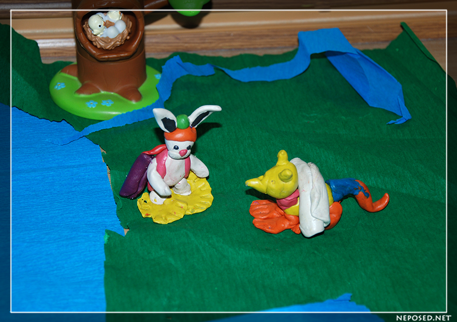 Это уже Даня инсценировал рассказ "Как лиса гусят пасла". Лиса притворилась, что уходит в другой лес жить, гусят пасти и предложила зайцу пожить в своей норе, а потом неожиданно вернулась и чуть его не съела.