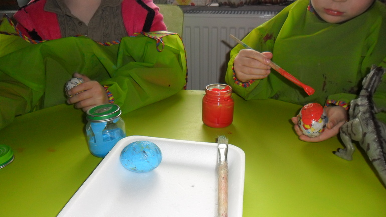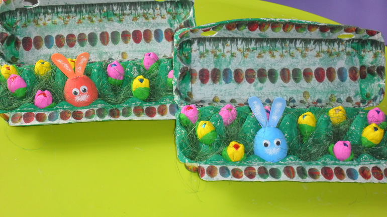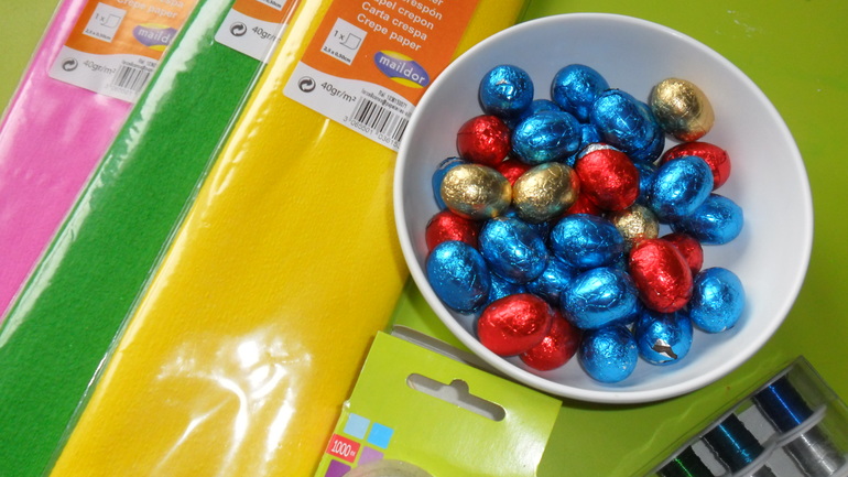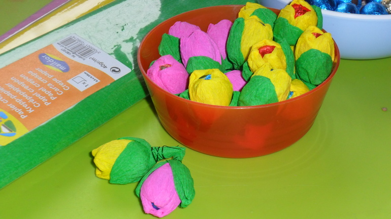 Яйца мы превратили в милых зайчат, окраска которых - личный выбор детей. А маленькие шоколадные яички упаковали в цветную гофрированную бумагу в виде цветочков. Правда цветочки крутила в основном я, а дети были заняты поеданием этих самых яичек :)