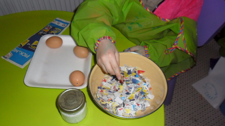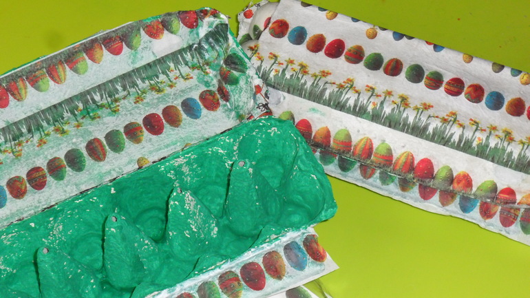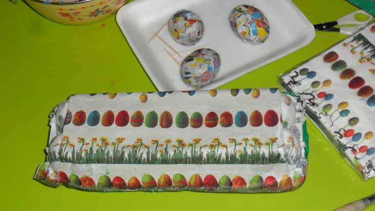 Дальше наши зеленые короба мы обклеили веселенькими салфеточками с пасхальными мотивами. Скорлупки от яиц обклеили папье-маше. Здесь уже у Леоника внимание было рассеянным, усидчивость - совсем не его конек. Человек-паук его манит сильнее рукоделия, поэтому мы справлялись с этой задачей с Эвелинкой.