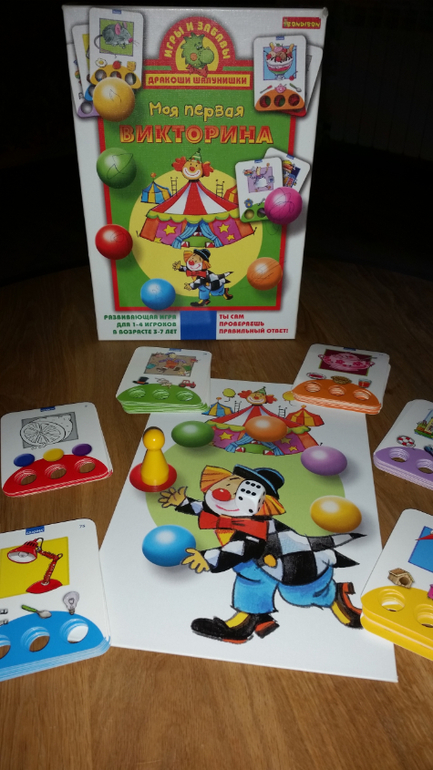 Суть:Каждый игрок кидает поочередно кубик и ходит на одно из цветовых полей, второй игрок задает вопрос с карточки соответствующего цвета. Каждый цвет это определенный тип вопросов: на логику, на профессии, на цвет и т.п. Игрок выбирает вариант ответа, просунув в отверстие палец, на обратной стороне отверстие с правильным ответом выделено цветом. При правильном ответе игрок забирает карточку себе. Мне очень понравилось, что ребенок учится логически не только отвечать, но и формулировать вопрос.