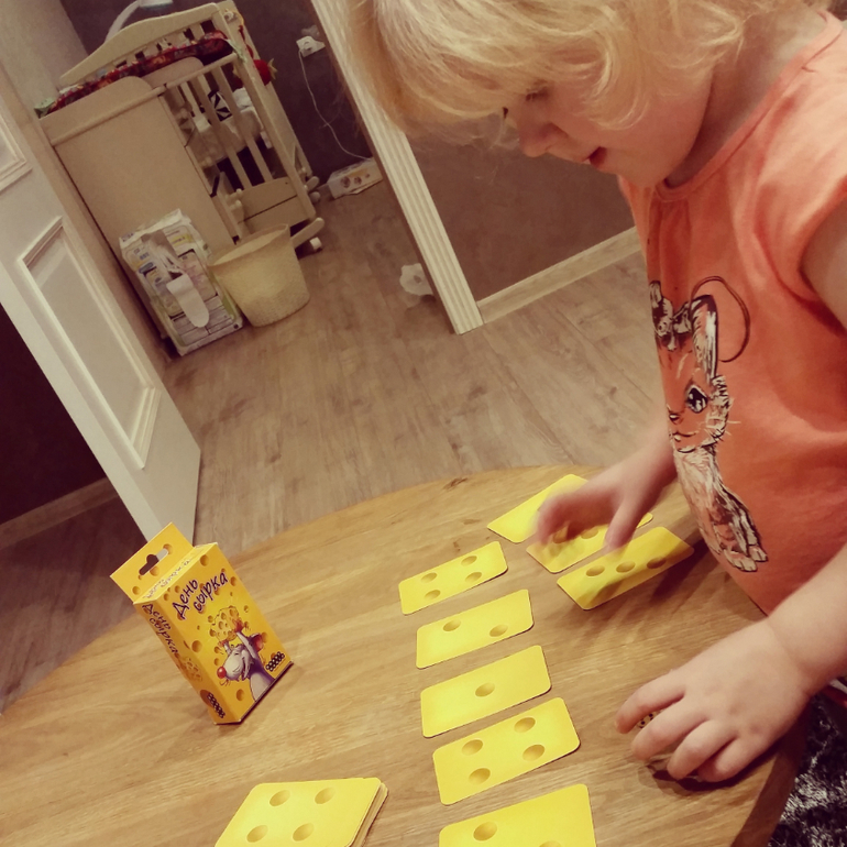 Суть: Из колоды карт выкладываются 6шт, игрок кидает кубик и берет карту с таким же числом как на кубике - там может быть сыр или мышеловка, выигрывает тот кто наберет больше сырков, а проиграет тот кто наберет 3 мышеловки. Самая азартная игра из наших