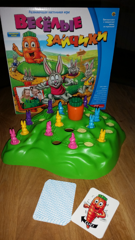 Суть: у каждого игрока по 4 зайчика и надо первым привести хотя бы одного зайца к морковке. Загвоздка в том, что зайки прыгают по ямкам, а они иногда проваливаются (поворотом морковки), но может и повезти и выпадет карточка с 1, 2 или 3-мя прыжками