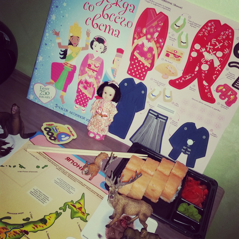 Еще стараюсь придумать Арине одежду из шарфов под стать стане, смотрим танцы или праздники народов на Youtobe, иногда готовлю или покупаю типичную еду страны, которую изучаем.