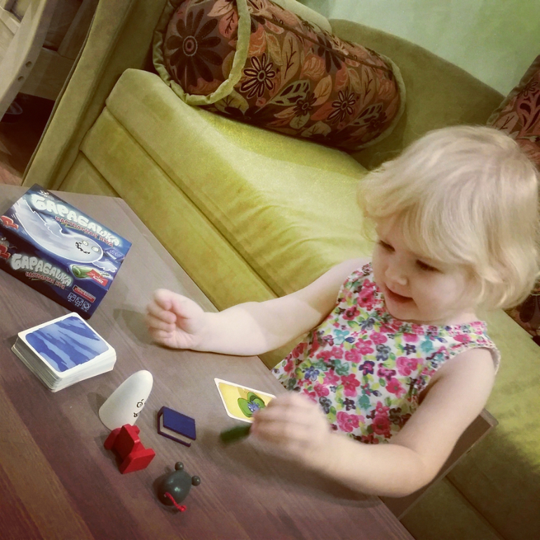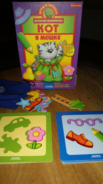 Суть: Из колоды берет игрок верхнюю карту и должен методом исключения выбрать из пяти предметов нужный (цвет и предмет указанный на карте исключается, если он не совпадает с реальным цветом предмета). очень хорошо для развития логики и внимания