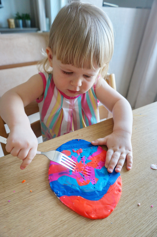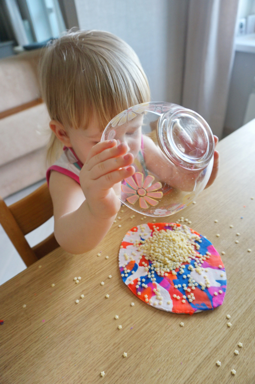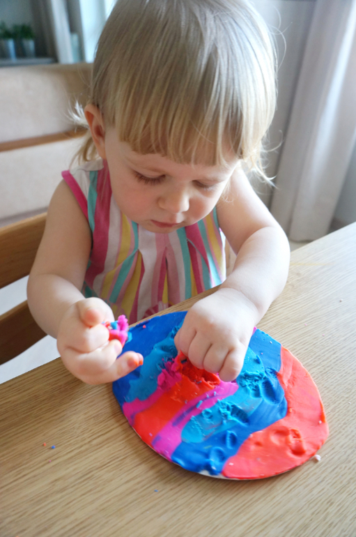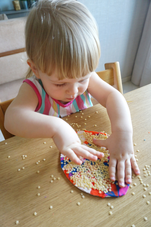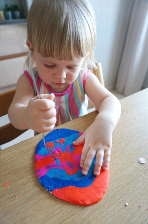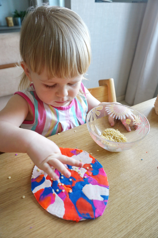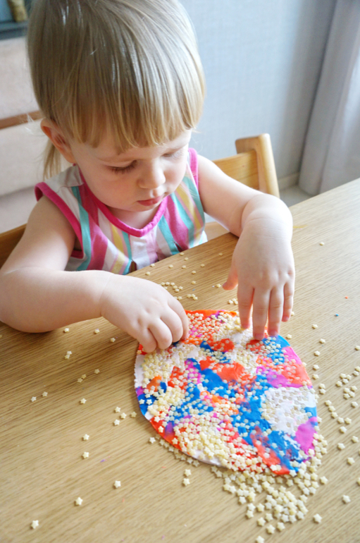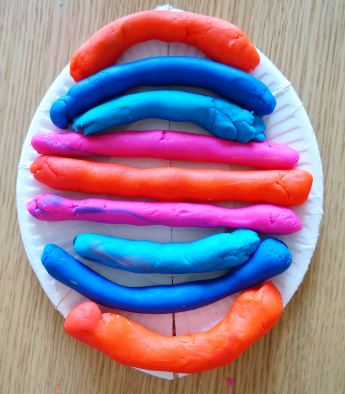 Мистер Умелец или Очумелые ручки (поделки, аппликации, интересные находки, идеи и задумки)Пасха все ближе и ближе. Объемные яички из пластилина мы уже делали, пришел черед плоских. За основу взяли чуть обрезанную одноразовую бумажную тарелку. Экспериментов у Маши было много: прилепляли разноцветный пластилин, ровняли скалкой, кололи вилкой, били толкушкой, украшали шариками, а закончилось все декором из мелких макарон-звездочек! Получилось так солидно, что решили сделать бабушкам подарки к празднику!