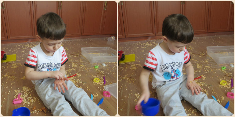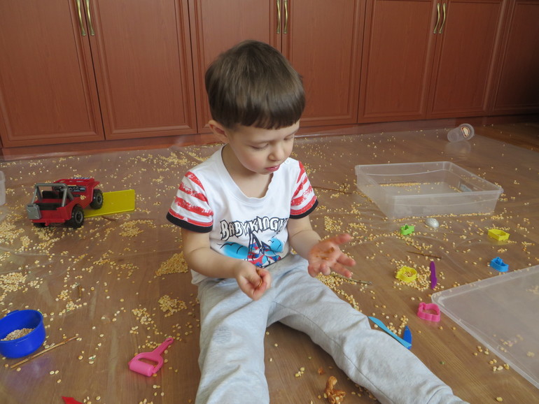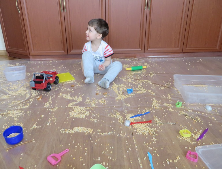 Классно. Люблю я такое свободное творчество. Лёня играет долго, сам придумывает игры. А если займется уборкой или машинами, то тут вообще не отвлечь. Но постоянное передвижение ему требуется. Он даже бегает по гороху. Иногда прерывается минут на 10, уходит. А убирать ничего не дает, только я подхожу, у него новый всплеск.