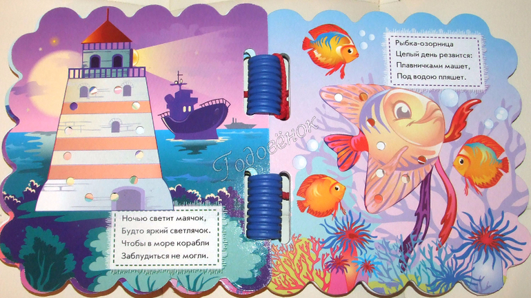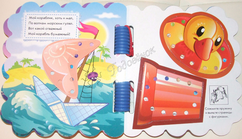 А вот как раз лист с запчастями: ведерко-маяк и подложка-спасательный круг. Их надо выдавить, а сами листы, откуда выдавливали, вынуть из книги.
