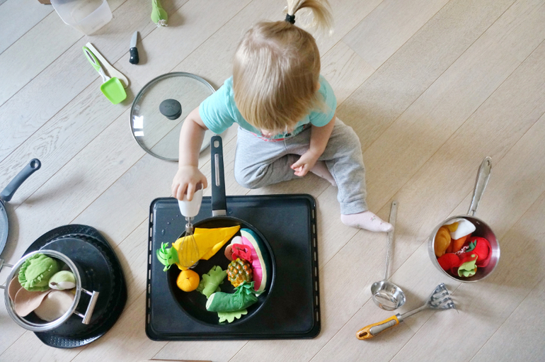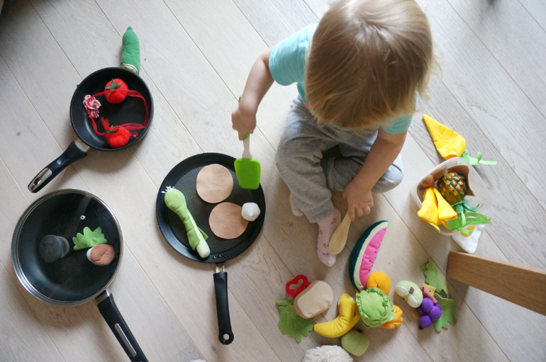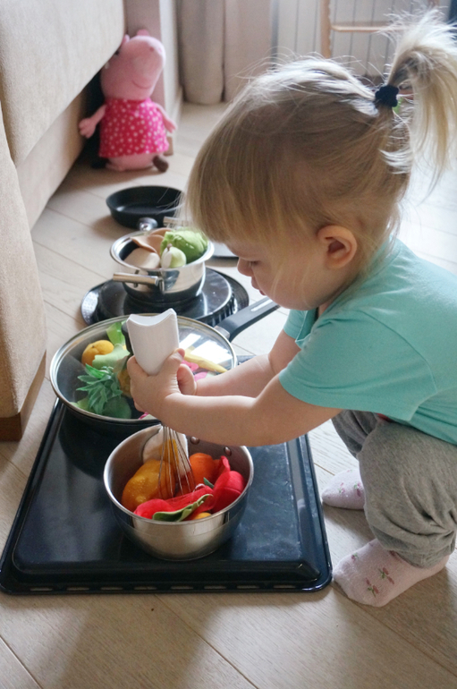 Игры и игрушки от 0 до 99 (Про игры и игрушки которые подойдут и большим и маленьким)Ко многим нашим занятиям я готовлюсь, а иногда игры возникают стихийно, по Машиному велению. Китайские блины не прошли зря, на следующий день ребенок устроил ресторан с жаркой блинов с луком и кормлением Пэппы! Даже наши бумажные морковки потребовались для варки супа! Опять акцент на сервировку стола, на красоту подачи еды, церемониал (об этом я писала в посте о питании)! Все чаще она просит играть с настоящими большими кастрюлями! В этом игрушечном мире все по-настоящему!