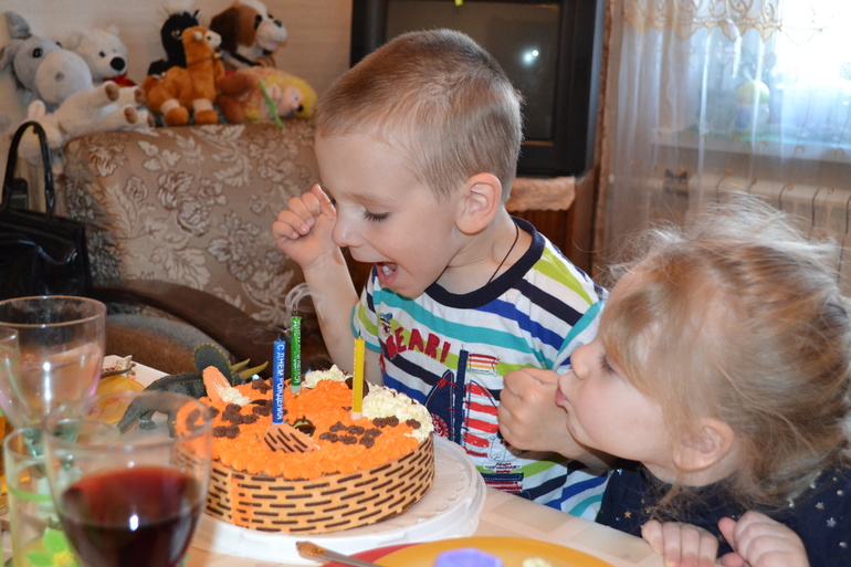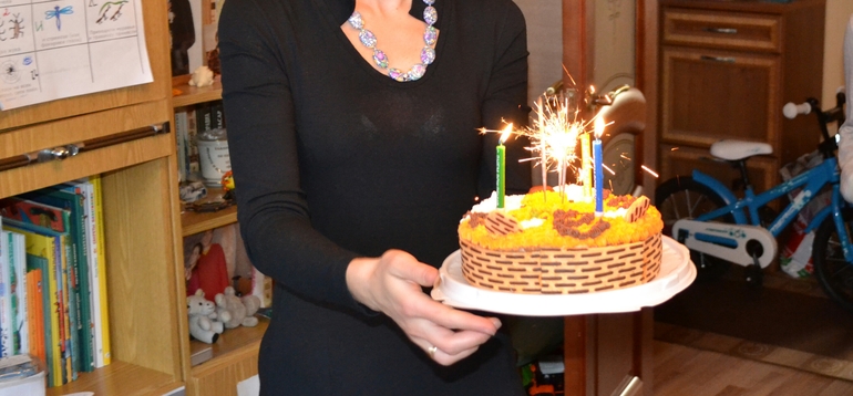 Звезду с помощью проволоки крепим на звездное небо. Радуемся и возвращаемся на Землю, где нас ждет праздничный торт. На торте помимо свечей зажигали бенгальские огни, очень эффектно получилось.
