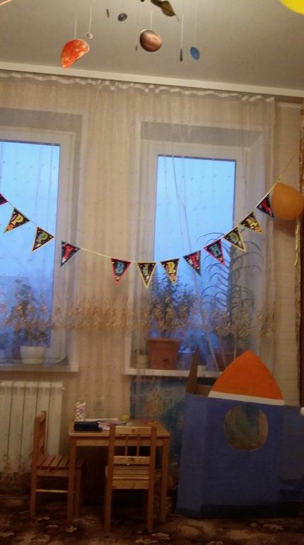 Декор комнаты: распечатали флажки с инопланетянами и ракетами.