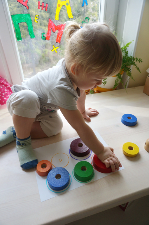 В такой же цветовой гамме у нас есть пирамидка икея. На скорую руку я обвела кружки фломастерами, Маша искала соответствие по цветам и размерам! Увлекательно, быстро, познавательно!