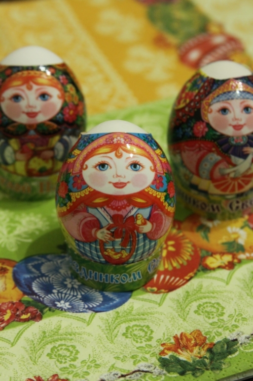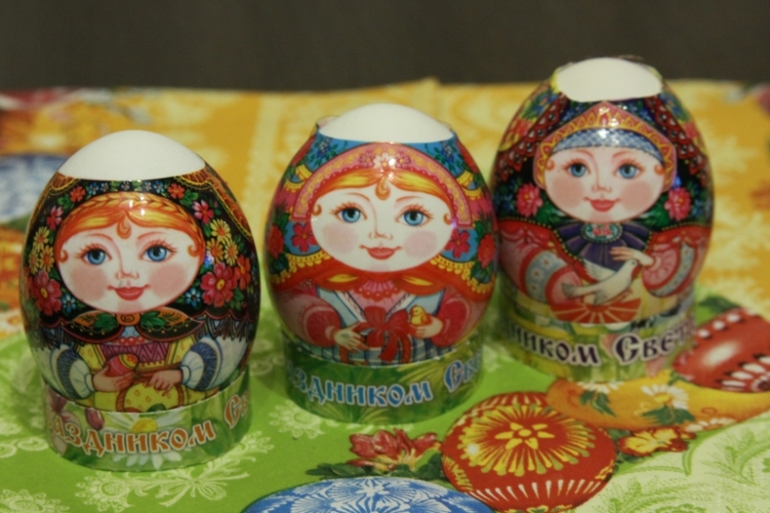 На столе у нас лежали в помощь прошлогодние книги, раскраски и вот такие яйца-матрешечки. Вообще не очень люблю термоэтикетки, но эти три яичка специально сделала.
