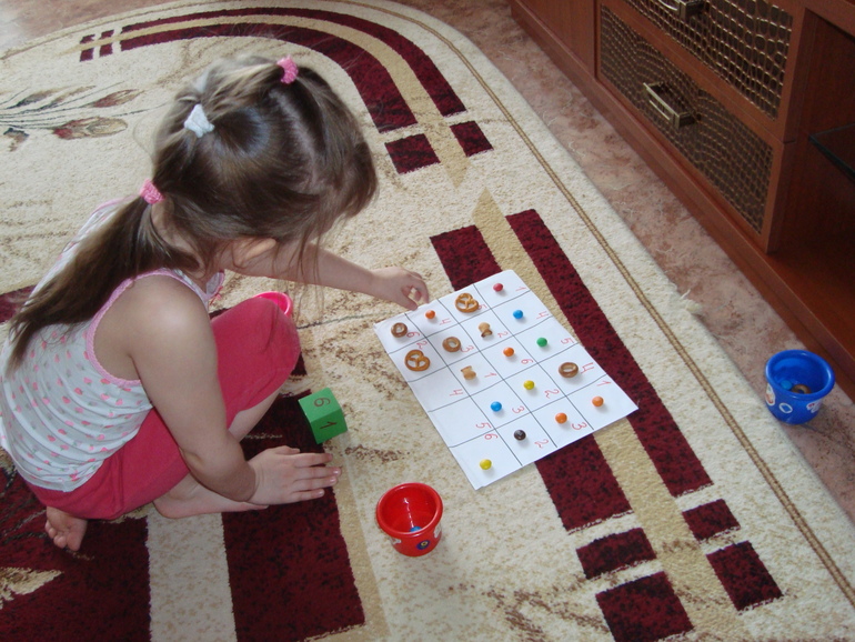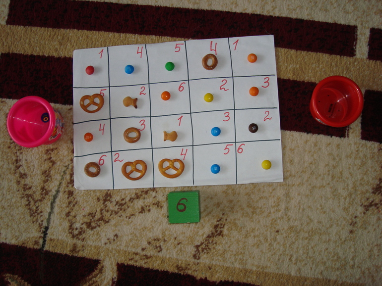 Принцип такой- на каждую клетку с цифрой кладем угощение и кидаем кубик с цифрами по очереди. Какая выпала цифра, с той клетки забираем сладость себе в стаканчик. По окончании игры садимся пить чай)
