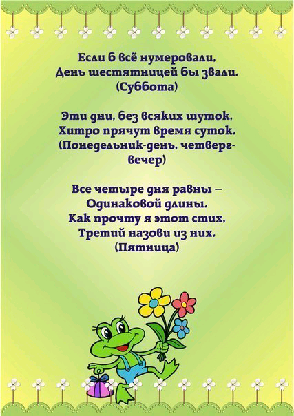Школа дошколят (все о изучении букв, цифр, развитии логики, памяти, воображения, мышления)Нашла замечательные стихи, которые помогают выучить дни недели, плюс задачки на дни недели,тренирующие внимательность у ребенка. Особенно понравился стих про крокодила,который каждый день ходил по гостям. Выучили его, пока шли на хореографию с дочкой. Теперь дочка рассказывает его всем знакомым.