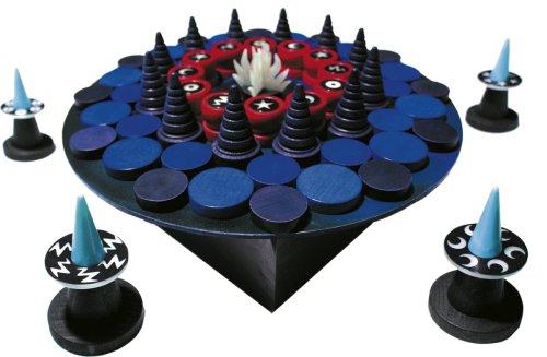 В комплекте поле с очень красивым рисунком - замок и лестница, ведущая на вершину. Также есть метла (с магнитом), фишки (с магнитами) и кубик. Цель - первым забраться на вершину башни. Там ждет Хрустальный шар - для интереса кладу марблс. Каждый игрок выбирает фишку, ставит ее на старт примагничивающейся к метле стороной вверх. Бросаем кубик. Выпала цифра - перемещаем свою фишку на указанное количество шагов. Выпала метла - летим! - подносим метлу к фишке, она примагничивается, и летим к следующему по ходу значку Метла на поле. Выпала цифра со стрелочкой - перемещаем свою фишку на указанное количество шагов, а потом - немножко вредим - переворачиваем фишку любого другого игрока примагничивающейся стороной вниз! Таким образом, если этому игроку выпадет метла, он не сможет полететь!