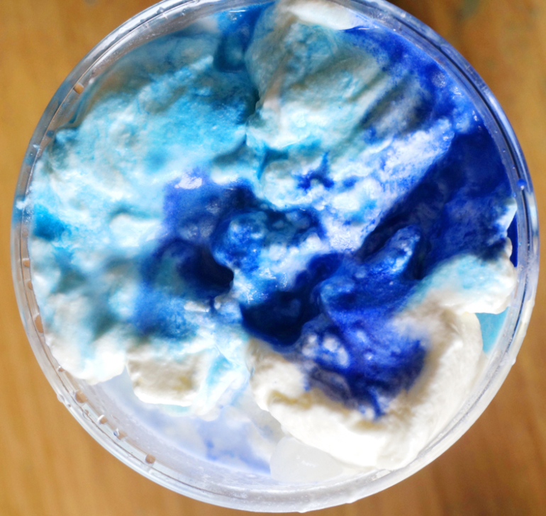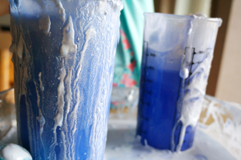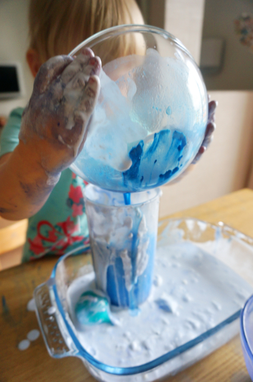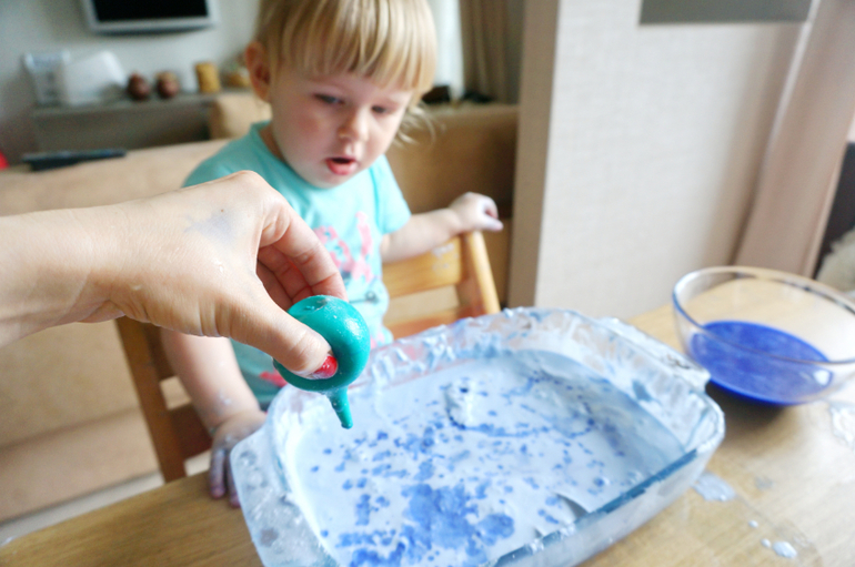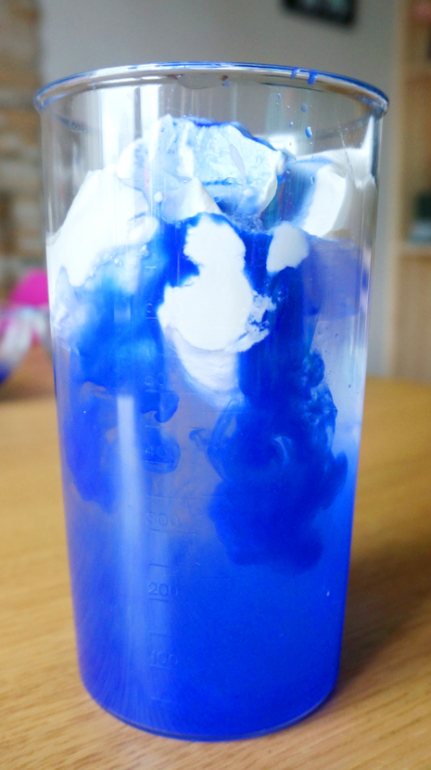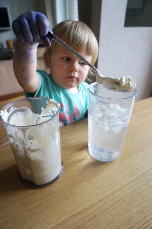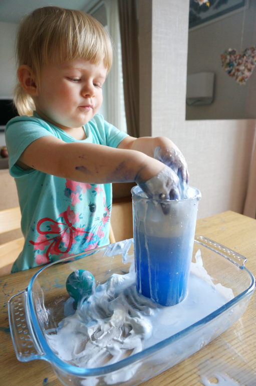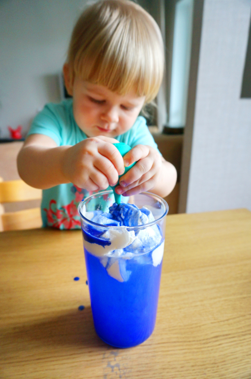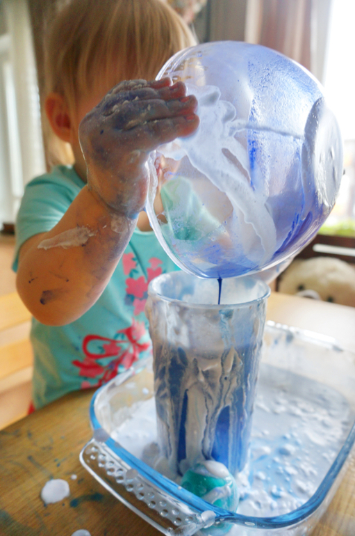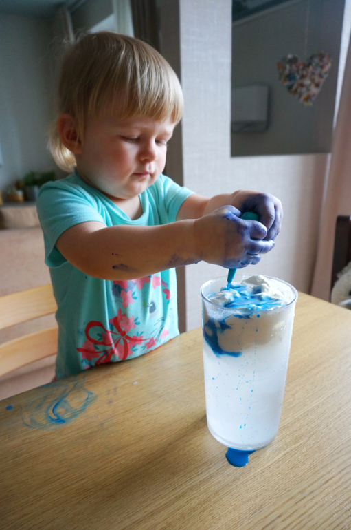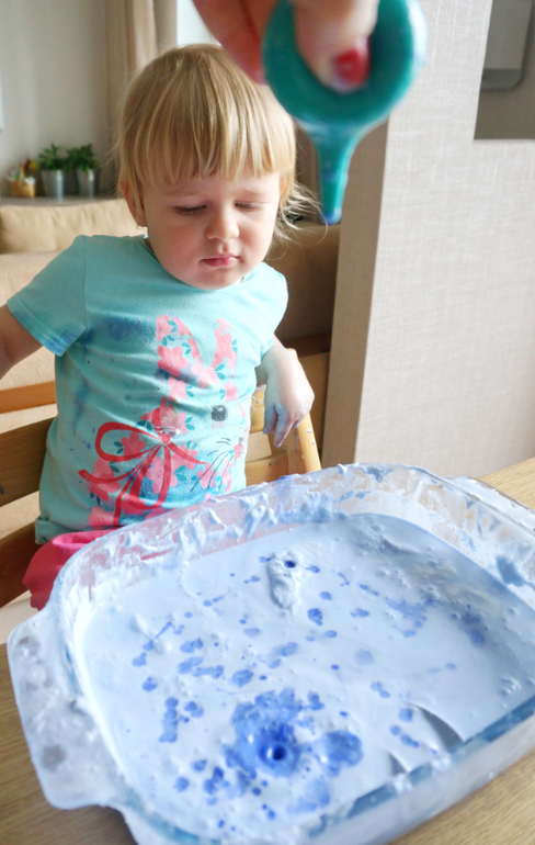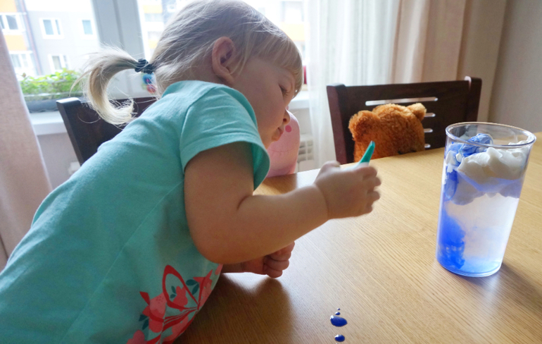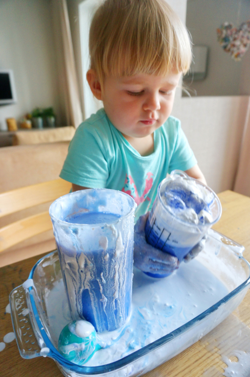 Игры и игрушки от 0 до 99 (Про игры и игрушки которые подойдут и большим и маленьким)На эту игру меня вдохновила Ольга со своей доченькой! Воскресное утро, город спит, не спит только неугомонная Маша. В холодильнике от прихода гостей остались сливки 33%. Взбиваю остатки, развожу синюю гуашь, наливаю стакан воды и дарю ребенку дождь! Красота неописуемая! Столько вариаций цвета, погоды, диффузии. А после экспериментов, сколько возни и радости в жирных синих сливках! Руки до сих пор не отмылись!