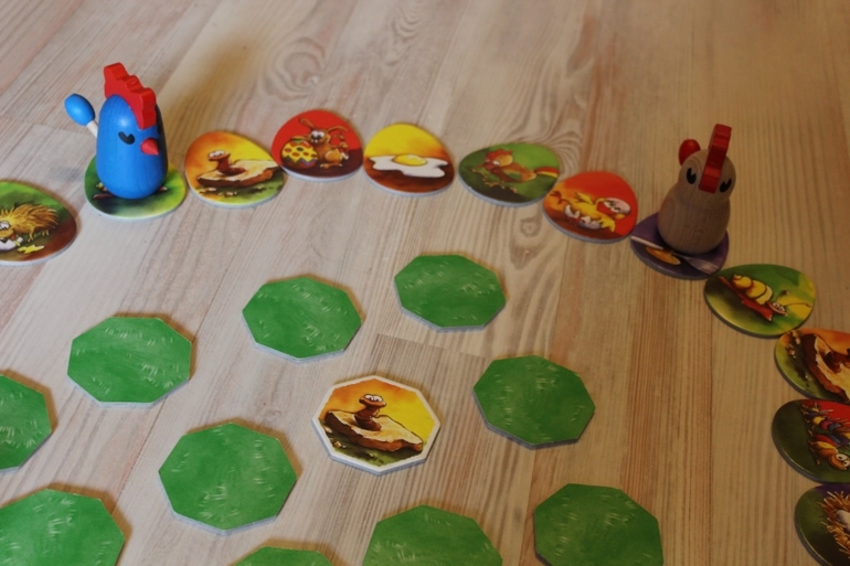 Начинает игру самый младший. У нас это будет беленькая курочка. Двигаясь по часовой стрелке, она должна найти в поле перемешанных тайлов тот, который перед ней - улитку (яйца дублируются два раза).
