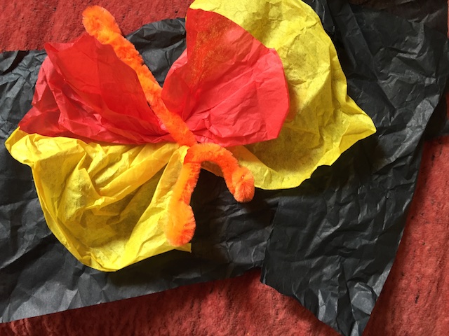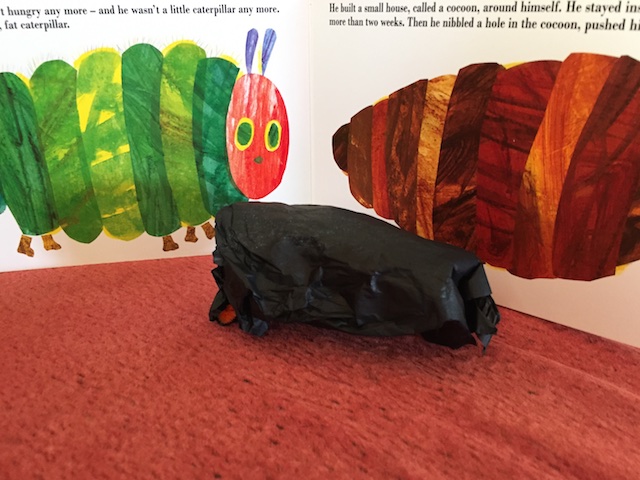"Гусеницу" мы читаем обычно между делом (не перед сном, как большинство книг), то на русском, то на английском. А началось все с бабочки из папиросной бумаги и синельной проволоки. Она лежала на диване, когда Настя попросила почитать "Гусеницу". Так как мы часто инсценируем прочитанные истории или играем "по мотивам", девочка моя с энтузиазмом откликнулась на предложение сделать "настоящую" гусеницу. Смастерили за минуту из проволоки.