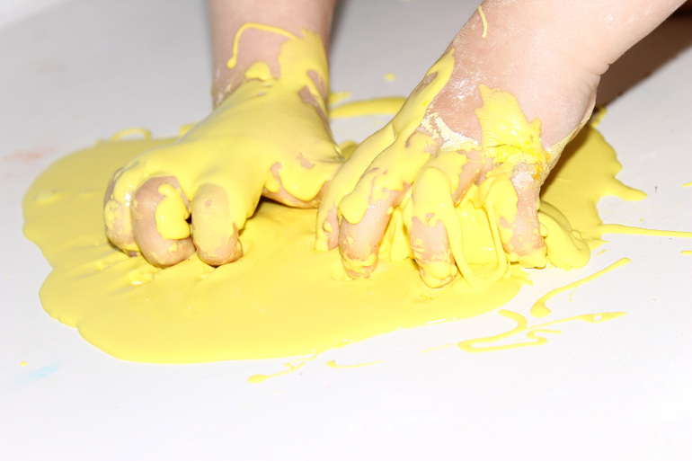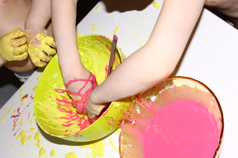Дык и написано вода+крахмал+краситель:-) . Я не могу дать точные граммы и мл ибо  делаю на глаз. Крахмал высыпаете в миску, добавляете воды понемногу, и перемешиваете (примерно 1,5 части крахмала,1 часть воды). Прямо руками. Вы почувствуете нужную консистенцию. Лучше высыпать не весь крахмал, на случай если с водой переборщили, чтобы можно было еще добавить