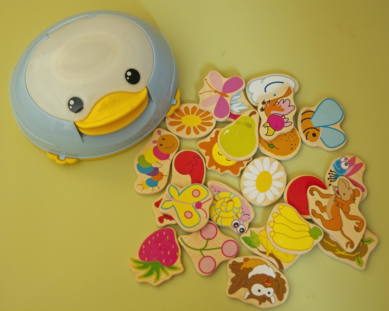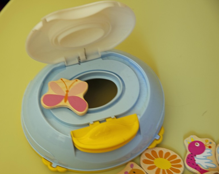 Первая наша самодельная игра/игрушка была сделана из всем известного футляра от влажных салфеток Goon. Как только дочь стала проявлять к нему интерес и процесс смены подгузников стал затягиваться, я вынула из него салфетки и предложила "покормить уточку". Под руку попались деревянные фигурные магниты, которые, кстати, не всегда просто засунуть в отверстие.