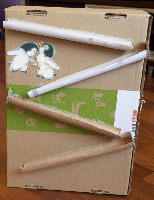 Нам понадобятся: коробка, разрезанные вдоль, трубочки из под бумажных полотенец, клей-пистолет, картинка для привлечения внимания и маленькие шарики ( у нас декоративные для цветов из фикс-прайса).
