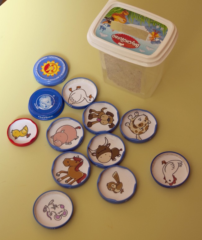 Внутри крышек рисунки для лото, найденные на ББ (сори, не помню автора). Так ребенку намного интереснее, даже просто перебирая крышечки (они у нас хранятся в банке), вынимая по одной и изучая, кто изображен и какие звуки он издает, с помощью мамы, конечно. Позже вынимая уже по запросу, ища кошечку или быка.