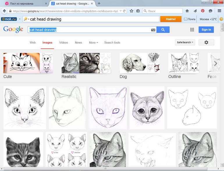 Просто заходите на google картинки и вбиваете "cat head drawing" (для примера), выбираете ту картинку, которая нравится, и печатаете в нужном размере.