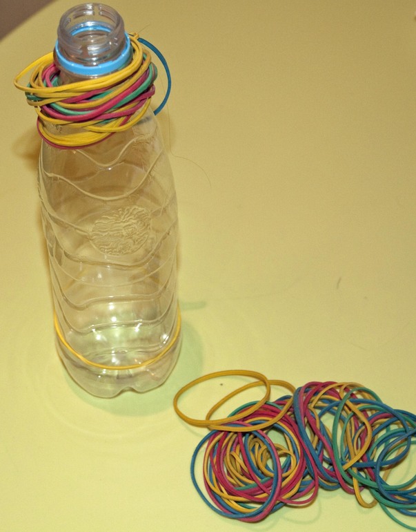 Вариант попроще там, где горлышко и посложнее, где дно (прикладываем усилие, растягивая резинку).