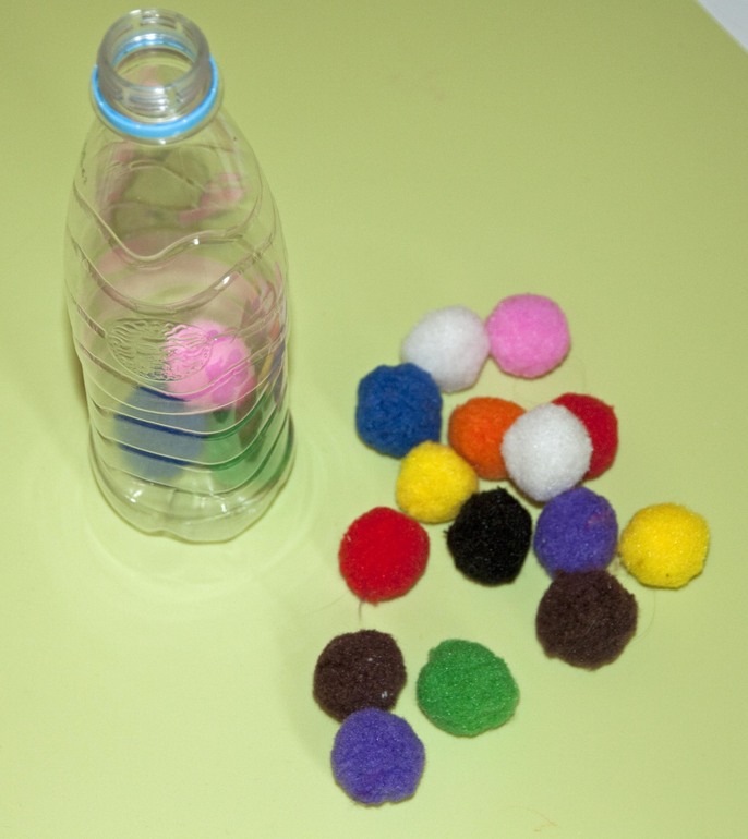 - помпоны (любим их больше, чем предыдущий вариант, хотя, их не так просто просунуть в более узкое горлышко, чем они сами. Возможно, т.к. они мягкие, а поэтому более приятные)