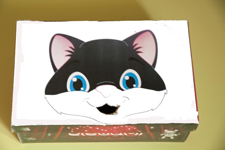 Если снова возвращаясь к теме "покормить" (благодатная она), вот совсем вариант "из того, что под рукой": коробка из под обуви и распечатанная на принтере мордочка кошки.