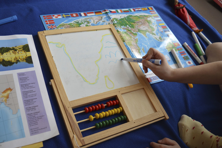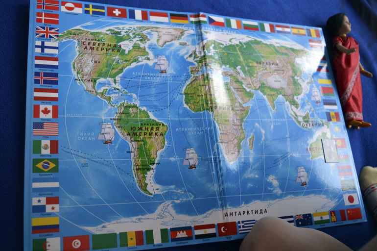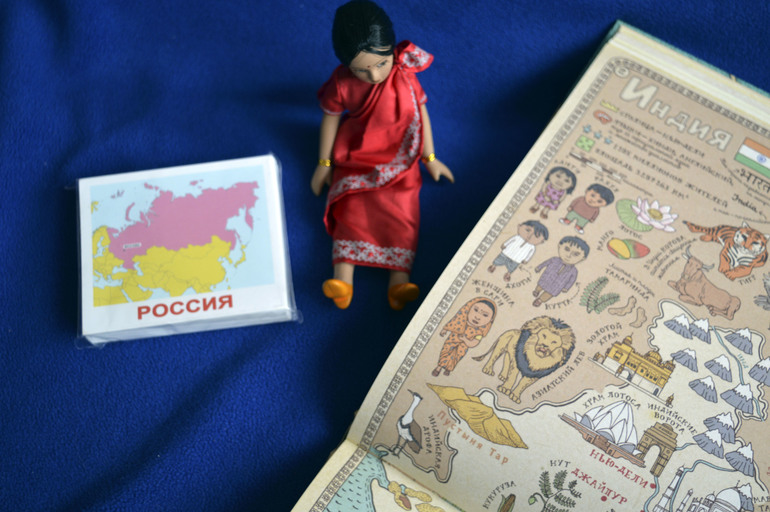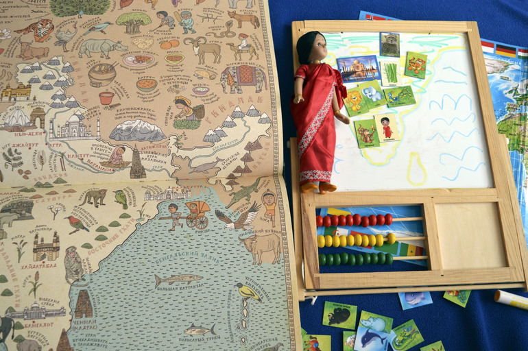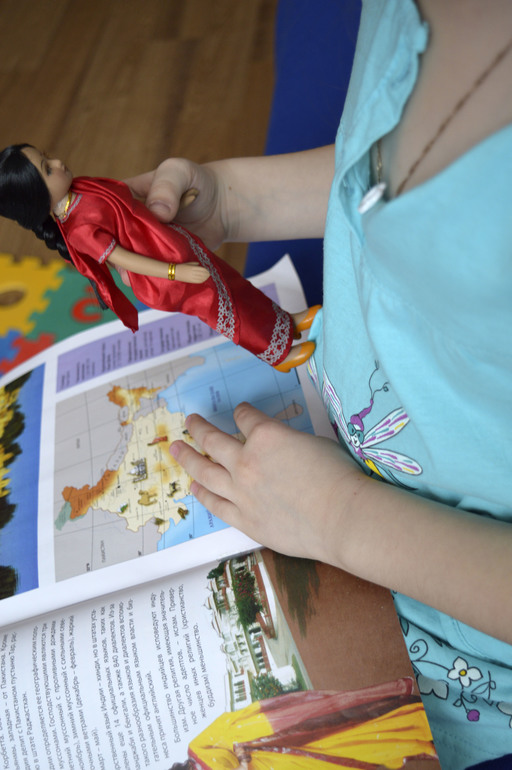 Игры и игрушки для ребят от 3 лет и старшеАнютка часто спрашивает о всяких странах и разглядывает большую карту. В этот раз мы решили отправиться в Индию. Почему именно туда? а вот дочку заинтересовало, что такое на лбу у девушек красное на лбу( увидела в одной из книг). К этому случаю я ей еще прикупила куклу фарфоровую с журналом.
