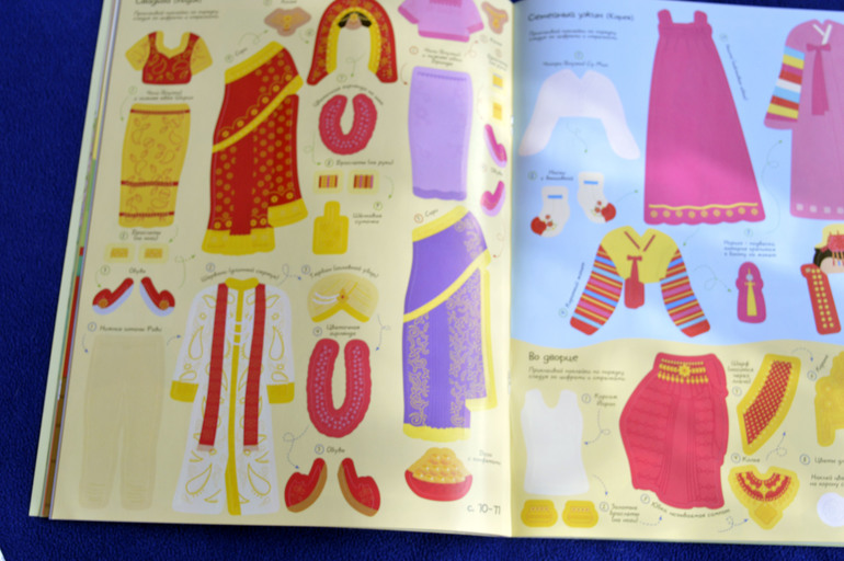Заинтересовали Анютку и одеяния Индианок. Мы рассматривали разные сари. А потом в книге с наклейками "Одежда со всего света" мы познакомились с тем, из чего состоит их полный костюм костюм. Оказывается не только из сари. В книге понравилось то, что пронумеровано что за чем одевается, поэтому легко ориентироваться.