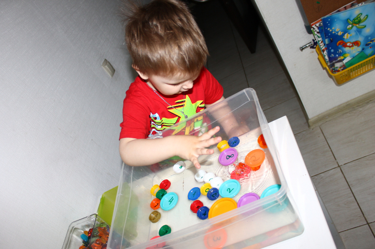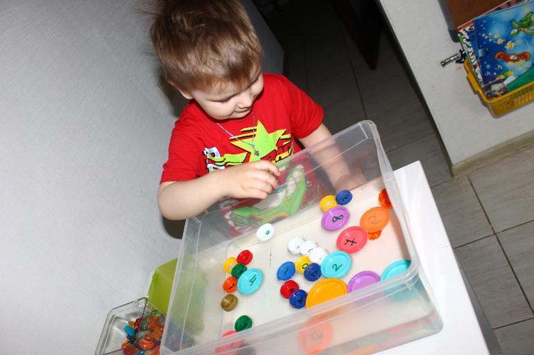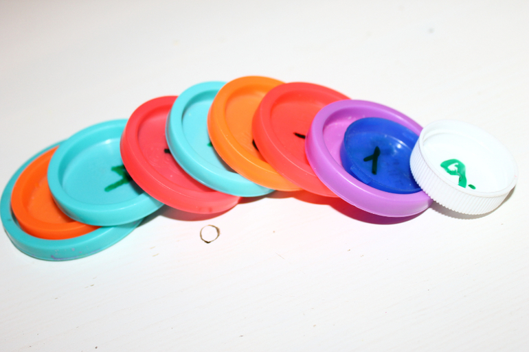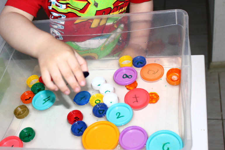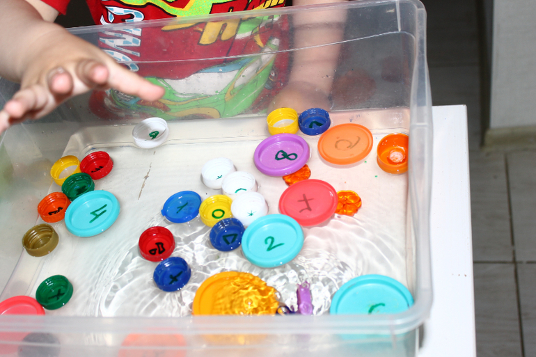 Для малышей можно рисовать не цифры, а символы (елочки,звездочки,геометр.фигуры и пр) и затеять такую игру: опустить крышечки в емкость с водой рисунком вниз и открывать по 2,ища пару.Или представить,что крышечки это кораблики. Дуть на них,устраивать шторм и бомбардировку ,кидая снаряды или наоборот тихонько складывать грузы и считать какой кораблик выдержит больше грузов, сажать пассажиров (маленькие фигурки из киндеров)