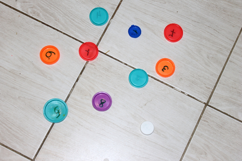 На крышках указаны цифры, кидаем со стола на пол, крышка упала цифрой вверх - вам столько очков, цифрой вниз- о очков. Темик просто кидает)) Ему просто весело