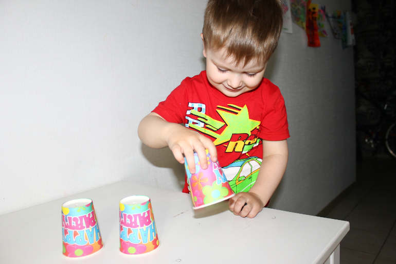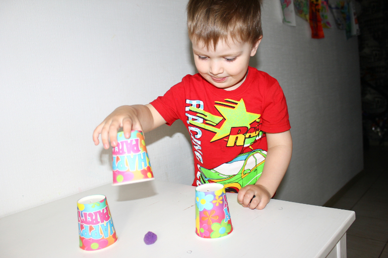 Дети крутят друг другу, я кручу им, они мне. Вариаций много.Самый интерес незаметно помпон убрать вообще. Когда дети не находят его ни под одним из стаканов удивляются так искреннее.