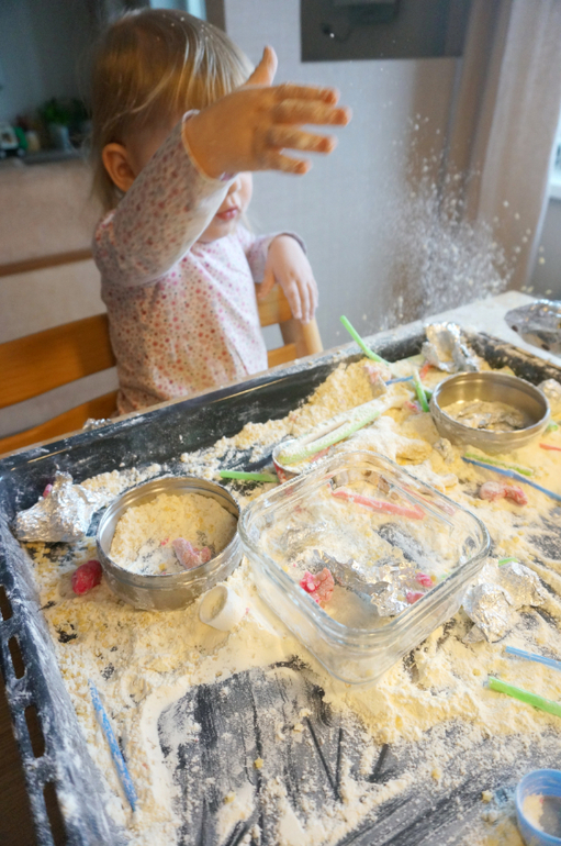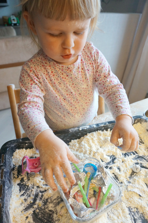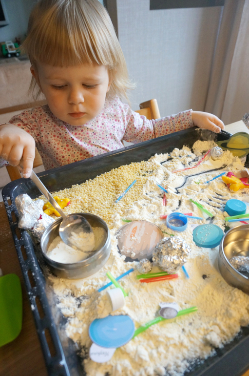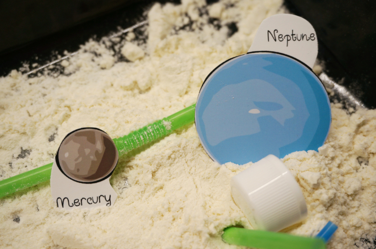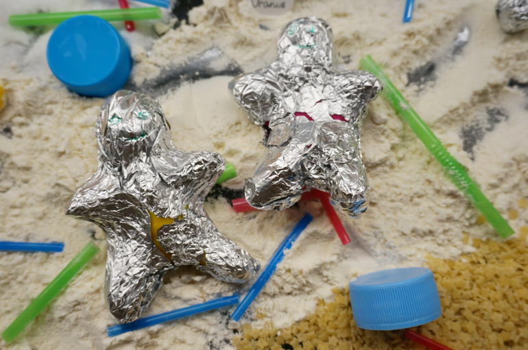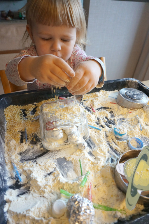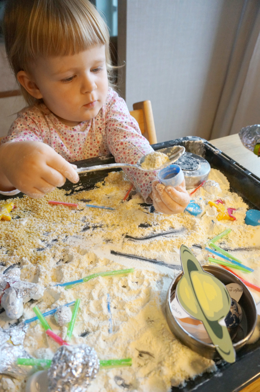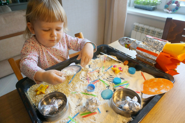 Самодельные игрушкиМне как-то трудно говорить о космосе, правда, я не знаю как должны изображаться планеты, какая у них поверхность итд, одним словом, изучаем космос вместе. На этот раз у Маши была сенсорная коробка с версией, что космонавты высадились на неизведанную планету, где много неизвестных предметов, с которыми стоит быть осторожными! У ребенка фантазия работает лучше, сначала она проверила лепятся ли из инопланетного песка пирожки, потом собрала межгалактический мусор в корзину, затем у нее пошел кислотный дождь и мы прятали космонавтов в стеклянную колбу-дом, а потом у них порвался скафандр и мы его чинили, а по прилету домой, Маша, как всегда, всех лечила! Я стала больше знать о космосе, это факт!