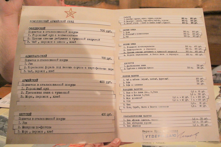 На первом этаже малюсенькое кафе, буквально на столиков 10, но очень колоритное - официанты в военной форме, некоторая еда из армейской посуды ложками. Папу нашего этим всем не впечатлить, тк в армии он этого всего уже наелся сполна и из такой посуды, а мне стало интересно, да и перекусить время уже пришло.