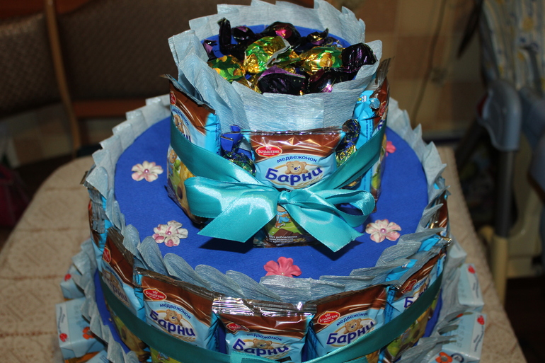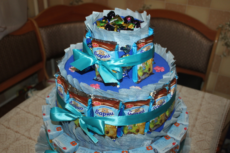 Мистер Умелец или Очумелые ручки (поделки, аппликации, интересные находки, идеи и задумки)Вот и подходит к концу еще один наш год в саду.... День рождение у нашего Славика летом и поэтому конфетки для детишек мы носим в мае. В этом году мне захотелось оформить сладости как-то необычно. Чтобы получился именно сюрприз, не только для детишек в саду, но и для самого Славика. В результате получился вот такой торт из сладостей, барни и сока!!!