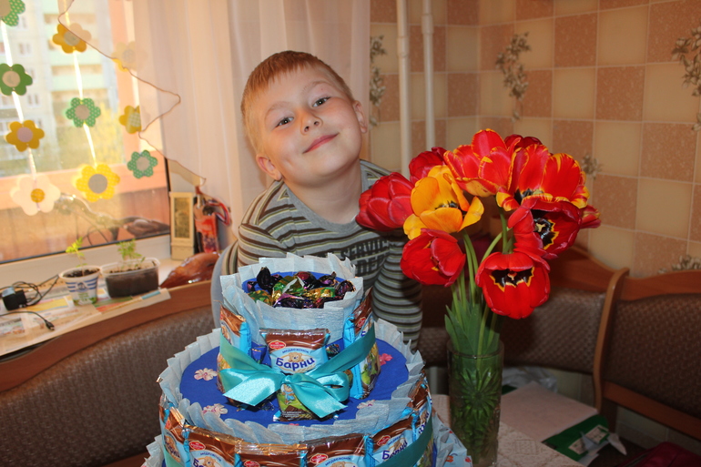 Тортик делала по ночам, когда все наконец укладывались спать. Хотелось, чтобы получился именно сюрприз. И все получилось! Вчера, когда внесла тортик Славик просто обомлел. Был такоооой восторг! Столько счастья! Ради таких минут можно потратить много ночей. Его первый вопрос был:"Мама, где ты купила такую красоту?" Сынуля мой никак не мог поверить, что я все сделала сама. Расспрашивал где я взяла такую бумагу, где купила ленточки, как прикрепила соки и барни. Короче вопросов была куча, а сам тем временем ручками аккуратно исследовал торт. Реакция получилась именно такой о которой я мечтала.