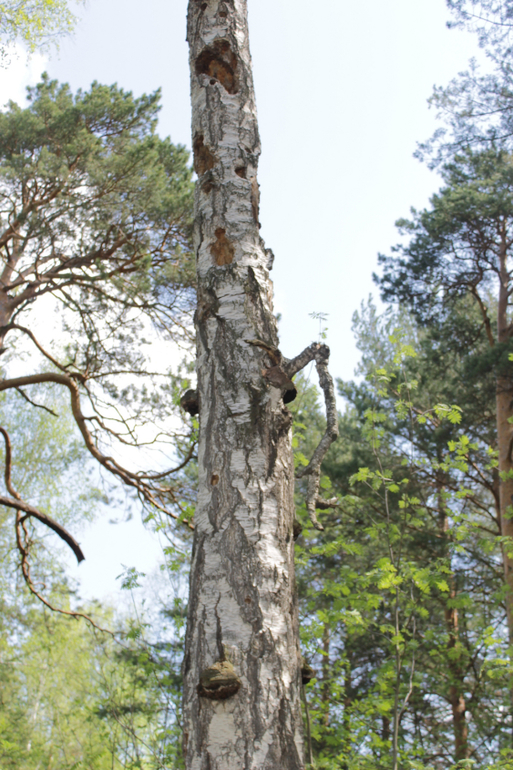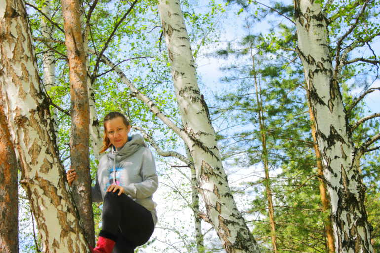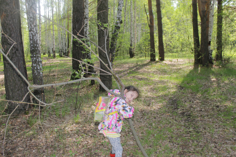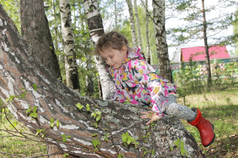 Мне очень нравится идея лазания по деревьям, как развитие физической силы, ловкости, координации движений, но у нас в лесу таких деревьев на которые можно залезть очень мало, а потому когда нам встретилась эта березка с сосной мы резво принялись по ней скакать, залазить и спрыгивать, издавая боевой клич уральского маугли))