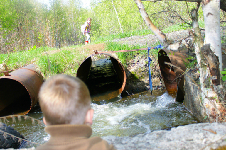 Начну с того,что дачный участок у нас крайний и находится совсем не далеко от озера.Прямо за нашим забором протекает небольшой ручей, там и была наша первая остановка. В этот ручей вода стекает с 3х мест, из 3х труб. Дети развлекались тем,что отправляли природные кораблики (щепки, ветки, сухоцвет) в трубу с одной стороны и бежали смотреть где же этот кораблик окажется.