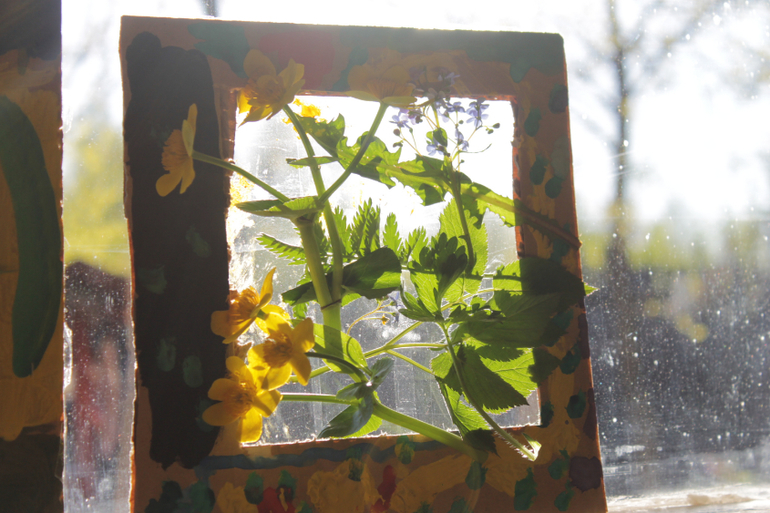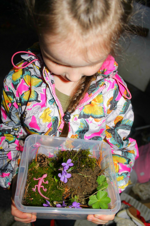 У каждого ребенка появился свой мир, мы выбрали в лесу красивый участок и просто пересадили его в наши коробочки. В коробку попалась не только различная трава, но и дождевой червь Петька, паук Лаврентий и клоп Мишка. Периодически Петька появлялся на поверхности, иногда на цветы садились бабочки,чему дети несказанно радовались.В планах на ближайшие выходные приобрести микроскоп, нам жутко не терпится рассмотреть все в новом ракурсе.
