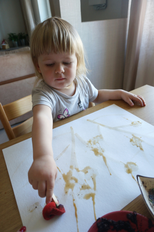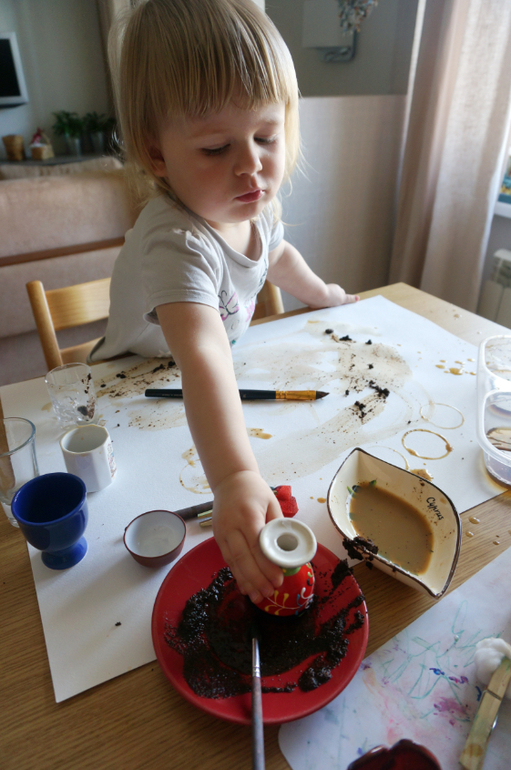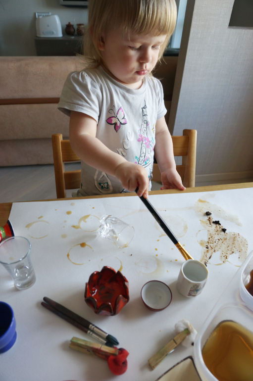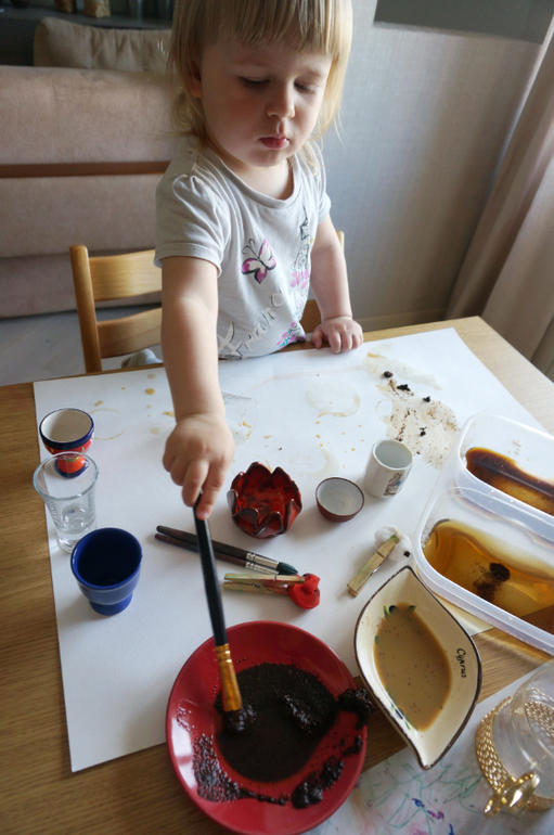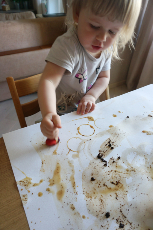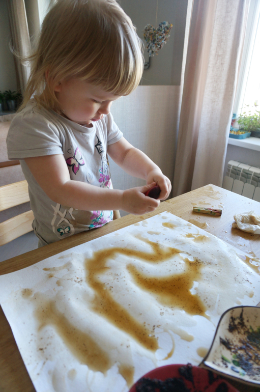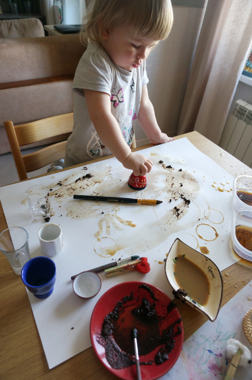 Художка ( красим, рисуем , придумываем новые способы рисовать)Я знатный кофеман, но вот ни кофе, ни чаем никогда не рисовала....и тут вдруг, после посещения фестиваля культпаркоv, нашла на нас волна кофе-арта. Заготовила немного крепкого кофе и чая после завтрака, выдала Маше разные посудные девайсы и акварельную бумагу для впитывания. Мы много экспериментировали, как оставляет след бокал, рюмка, губка, вата, кисть....добавляли немного кофейной гущи, пытались дорисовывать узор из клякс...аромат стоял на всю квартиру расслабляющий, одним словом, арт терапия....